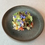 香ばしく焼いたハモと、京野菜の万願寺唐辛子。これら初夏を感じさせる和の食材が、イタリア料理の“締めのご飯”に登場する。何とも新鮮な体験だ。また、締めのご飯料理なので、重たくならないようハーブが加えられ、さわやかな風合いに仕上げられている。