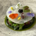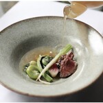 全国各地から仕入れた素材の良さを活かし、炭火で焼き上げるなど調理法から器具にまでこだわった料理は、見た目も味もハイクオリティーと評判です。人気のサラダは、野菜ソムリエが選んだ旬の野菜を使い、シンプルながらも丁寧な味わいが魅力。 食後に提供されるチーズもチーズプロフェッショナルが厳選したものです。フランス料理にも和を感じられるよう、日本の食材や調味料を使用するなど工夫を施しています。