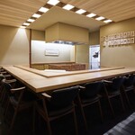 店内はL字形のモダンなカウンターで席数は9席。カウンターの中にはレンガ造りの焼き場があり、臨場感のある造りになっています。床と椅子は黒色でまとめられ、シックで高級感溢れる雰囲気です。