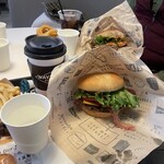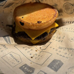 対照的なのが「チージーバーガー」。マフィンで挟んでいるように見えますが、然に非ず。クラウン(上バンズ)を上下逆さまに引っ繰り返してのせています。これも「仕様」です。バターオイルを塗ってトーストした裏面が表に来て、食べるとシャリッシャリ! バターの風味プンプン! ほぐれのよいUSビーフパティ2枚にチェダーチーズ4枚。生野菜は一切入らない、パンと肉とチーズだけのバーガー。これがまぁ~とんでもなく“ギルティ”な味わい!「そう来なくっちゃ」というぐらいの背徳感! これは理屈抜き。何も考えないで食べておいしいバーガーです。よくぞ作った! 快作!