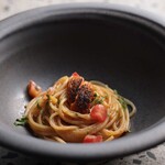 毛ガニとフルーツトマトの冷製パスタ、メロンをのせた鮎のコンフィ、炭火で焼いた牛肉のメイン……と、全11品という贅沢な内容ですが、一番おいしかったのは「新玉葱のチーズケーキ」。スイーツじゃないんです。淡路島の玉ネギ(あまたまちゃん)とクリームチーズを合わせ、玉ネギのローストパウダーをトッピングし、ソースは玉ネギの皮をキャラメリゼしたもの。玉ネギがビックリするほど甘く、えぐみも苦みも全くなし。これがスペシャリテと言ってもよさそうなぐらいです。