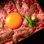 配膳されたステーキ重は文字通りタレがかかったレアステーキがご飯の上に鎮座していてとても美味しい!卓上に有った食べ方通り、3分の1はそのまま食べて、更に3分の1は卵黄を混ぜて食べ、残った3分の1をお茶碗に移し替えて胡麻や海苔をのせて出汁をかけて食べた。レアステーキをお茶漬け風に食べることに若干抵抗が有ったのだが、意外なことに??? なかなか美味しい!!! 』(tw29さん)
