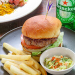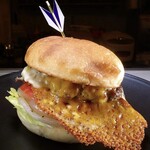 キーマ、すなわち挽肉のカレーです。ですから「カレー味のチリバーガー」とも解釈できますね。ハンバーガーのパティと同じUSビーフの牛挽肉に鶏挽肉を合わせ、クローブ、カルダモンなどのスパイスを加えて炒めたものが125g。パティと同量のっています。つまり、肉だけで250g。白いチーズはモッツァレラ。さらに揚げたれんこん。バンズは「カタネベーカリー」作。顔を近寄せると、後がけのスパイス「カスリメティ」の高級茶葉のような上品な芳香。キーマは意外にも口当たり丸く、甘い味わい。辛くはないです。そして後から来る肉の旨味が絶品!