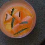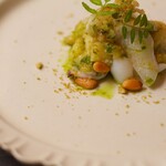 これにソムリエの三坂さんがペアリングしたのは、これまた意表を突くみりん。鳩とアニスのスティックはフレンチのパイ包みのような感覚だが、皮のパリパリ感とスパイスで異国の雰囲気をまとっていた。「みりんは、紹興酒をイメージしたペアリングです。料理の深いコクや香りを引き立てていますが、紹興酒と違って甘みがあるので、誰にでも飲んでいただきやすくなっています」とソムリエの三坂さん。コースの序盤から二人のサプライズが心地よい。