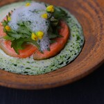 続く肉料理は、「金華豚 パプリカ 卵」。金華ハムに使われる金華豚をスペイン・バスク地方の調理法でいただく料理。「バスク地方は夏野菜がおいしい地域。豚肉には同地域の唐辛子やトマトを使ったピペラードソースを合わせました。ピペラードソースは卵と相性がいいので、卵を使ったサバイヨンソースを豚肉にかけています」とシェフの野村さん。見た目がカラフルで食欲をそそる料理だ。