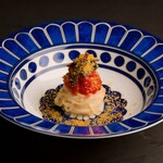 北海道の牡丹海老をマリネして黄色い野菜を使ったガスパチョと共にいただく一皿。細かくカットしたパプリカやきゅうり、みょうがなどの夏野菜と4種類のハーブをのせ、たっぷりのキャビアを添え、エスプレット唐辛子のパウダーを振りかけています。これだけ多種多彩な食材を一皿に合わせているのに、一体感があるのは秘密のドレッシングのおかげ!
