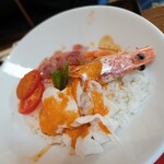 エビ、マグロ、タコ、トマト、レタス、その下にはやはり酢飯。野菜は地元産の新鮮・減農薬のものにこだわっており、ドレッシングも自分で手作り。クリーミーなシーザーサラダ的で、魚介類と合う。「確かにフランス料理ではサラダにクスクス入れるよな。あれと一緒か」と思えなくもない。