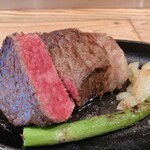 『ステーキ、分厚い!これはテンションあがる。肉山らしく赤身肉でみっちりだけど、脂身もそこそこ乗っていて、コントラストが嬉しい。