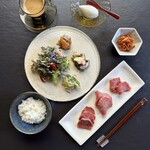 夜は漢方和牛のおいしさを様々な形で堪能できる「漢方和牛コース」(10,000円)があります。アラカルトでは、メインの焼肉で「漢方和牛」「くまもとあか牛」「黒毛和牛のエイジングビーフ」などを楽しめるほか、重等級の「ぬま田海苔」で巻いて食べる低温調理のユッケ「十勝和牛のユッケ」(1,450円)や「牛寿司」、藤沢市の柿右衛門農園から仕入れた新鮮な野菜で作る「有機野菜のナムル」(1種類450円)、「有機野菜のサラダ」(1,000円)などメニューが充実しています。