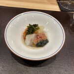『鰯、糸瓜、はす芋、どんこ椎茸の酢の物、梅肉』