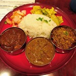 「3種カレー」1,600円を注文。この日のカレーは店名を冠したルナカレー、ポークビンダルー、フィッシュカレーの3種。これに副菜がつくのですがこの日は、くたくた茄子のタルカリ、アルゴビ、高菜のアチャールという3種でした。
