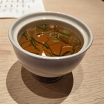 牡蠣はこのように可愛らしい海苔巻きで供されます。北海道のブランド仙鳳趾(せんぽうし)牡蠣でっせ。砂糖、醤油、酒などで煮詰めて、そこに牡蠣から抽出したエキスを合わせた、いわば和製オイスターソースを塗っています。牡蠣を牡蠣のタレで食べておいしくないわけがありません。めっちゃくちゃ濃厚ミルキーで、歯ごたえもプリップリ。上にはワサビではなくマスタード。これでピリッと味を引き締めるっていう計算です。やるう、中田さん。