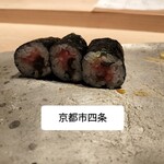 そして気になるでしょう「なかた巻き」。いわば同店のスペシャリテ的な一品で、たくあんの代わりに瓜の奈良漬とトロを巻いた、オリジナルの巻物です。要するに「とろたく」ならぬ「とろなら」。奈良漬の深い熟成味と甘み、瓜のコリコリ感がたまりません。