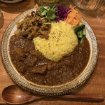 お昼のカレーを担当するのは若きシェフ。音楽活動を続けながらビストロで修行し、間借りカレーを経てこちらのランチタイムのカレーシェフとなったそうです。音楽とカレーの関係の深さは知る人ぞ知るところ。人気カレー店のシェフには元ミュージシャンが数多く存在し、楽曲の作り方とカレーの作り方は似ているという話もよく聞かれますが、こちらのカレーもアーティスティックな雰囲気を感じるものなのです。