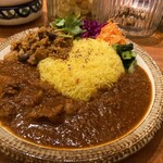 最初に訪問した時にいただいたのは「チキンカレーと山椒キーマのあいがけ副菜付き」1,200円に「レモンアチャール」100円を追加したもの。