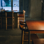 入り口を抜けて、店内奥へ進むと高い吹き抜けが。駐車場ならではの造りを活かした空間は、周囲の喧騒を忘れてしまう穏やかな空気が流れます。座席は、厨房を囲むカウンター席(14席)と、吹き抜け部分にあるテーブル席(24席)を用意。どちらも席ごとの間隔が広く、ゆったりと過ごせます。