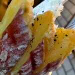 グラスの中には、焼き芋ペースト・鳴門金時芋棒・胡麻さつま・桜島むらさきクリームなど、芋好きにはたまらない素材が盛りだくさん! 芋の種類がそれぞれ違うので、いろんな味わいを楽しむことができます。中でも焼き芋ペーストはねっとり濃厚な甘さで、一度食べるとヤミツキになるおいしさ!! 塩気のあるさつまいもチップやさっぱりとしたアイスミルク、コクのある生クリームが、芋のおいしさを引き立てています。