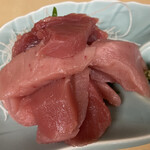 こちらに来たら誰もが頼むのが「マグロのぶつ切り」。見るからにおいしそうなマグロの赤身が、豪快に盛り付けられています。