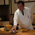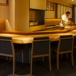 筆者が知る限り、最も腰の低い寿司職人かもしれません(笑)。店内はコの字形カウンターで高級感のあるしつらえですが、大将・中田和人さんの爽やかな笑顔といったら……!