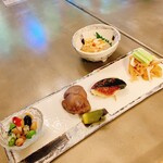 最初に供されるのがこの「前菜5種盛り」だ。ピータンを卵よせにしたり、マリネした牡蠣は敢えて細かく刻んだり、いつも見たことがあるようでない料理が並ぶのは、斉さんの経験からくる豊富なアイデアによるもの。