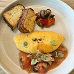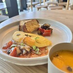 「喜心の洋朝食」2,400円は白味噌を用いた野菜のスープ、糀パンのトースト、九条ネギやチーズ入りのオムレツがセット。洋風だけど和素材を使っているのが京都らしいですね。