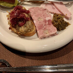 この日は「もち豚ポークリエット」「なめらかなレバーパテ」「豚ミミ、ホホ、タンで作ったテリーヌパセリ風味」「霧島サーモンマリネ」「自家製カラスミ」の5種。どれも単品でも楽しめる人気の前菜だ。