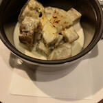 塩を振らずに低温で時間をかけて焼くことによりしっとりと仕上がった蝦夷鹿肉は、驚くほどやわらかく上品で、それでいて鉄分を含んだ野性味も残っている。もともとジビエの中でもクセの少ない鹿肉だが、肉本来のおいしさをじっくりと堪能できる一皿だった。