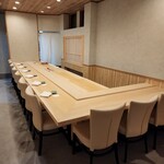 米山氏の新たな門出の場所は内幸町。新橋の賑やかさ、銀座の華やかさの隣で、落ち着いた雰囲気の中、ゲストにゆっくり寛いでもらいたいという思いから、この場所に出店を決めたそうです。白いのれんをくぐると、すっきりとした清潔感のある店内にL字形のカウンターがあります。できる限り装飾を排除して、シンプルな空間を意識した造りにしたとのこと。客席は現在6席の利用となっていますが、しばらくしたら席数を増やす予定だそうです。