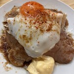 「チャーシューエッグ」はマヨネーズからチャーシューまで全て店で手作りされた自慢の逸品。チャーシューはジューシーで食べ応え抜群。目玉焼きは半熟具合も絶妙で、箸を入れるとトロ~リと黄身があふれます。甘めのソースと共にチャーシューにからめて食べれば、やみつき間違いなしのおいしさと評判です。