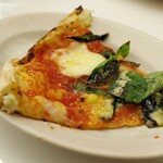 ベースとなるトマトソースは酸味がしっかりと感じられ、チーズに負けていない。しかしそれよりも香り高いのがピッツァ生地の小麦だ。店主の出身地である群馬県産の小麦粉で作られた生地は、トマトとチーズ、バジルの香りの中でもしっかりと存在を主張しながらも、とろんとした食感ですべての具材をやさしく調和させている。