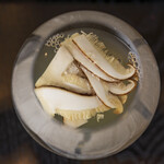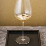 コースは、ワイングラスに入れられた、ふぐのだしと薄切りの松茸から始まった。じっくりと煮出した、滋味深いふぐのだしと華やかな松茸の香りが合わさり、最高のスターターとなる。