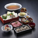 玉ねぎと豚肉を使ってあっさりしたすき焼き風のつけ出汁です。お好みで付属の山椒をつけ出汁へ入れてください。食べ進める途中で揚げゴボウをつけ出汁へ。香ばしい味への変化が楽しめます。