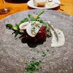 せっかくのフレンチも楽しめるお店ですからまずはオードブルを。「かさま苺と伊ブッラータチーズのオードヴル」700円は、上品な甘味とほのかな酸味が見事に調和した一品。オリーブオイルの香りも良く、お酒を飲みたくなる味。