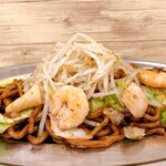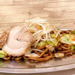 製麺所「浅草開化楼」の“ごわわし極太麺”が甘めのソースとよくからんでおいしい。分厚いチャーシューが2枚入っていて、麺とヤサイとニンニクと脂をよく混ぜて食べると、これがラーメン二郎の焼きそば版か!とうれしくなります。