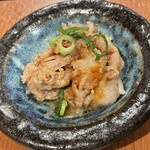 「月居 赤坂」では、秋から冬にかけて酸菜(発酵させた白菜)を使った「酸菜と羊肉の鍋」が提供されることがあります。2週間程度発酵させた発酵白菜を炒めて紹興酒を加え、鶏と豚のガラから取る毛湯(マオタン)スープと、別で2〜3時間炊いておいた羊のスペアリブ(骨付きバラ肉)を加え、強火で30分ほど煮込みます。最後に唐辛子やネギを振りかけて完成。