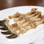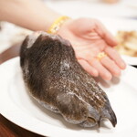 「広州原産で、皮が厚く身のしまった細身の鶏ながら肉の風味がいい。背中からお尻にかけては脂がしっかりのっていて、脆皮鶏にはピッタリです」と黄料理長。現在は、茨城の養鶏場で特別に飼育してもらっているそうで「1989年の東京店オープンに際し、徐社長は日本で鶏を探し始めたのですが、満足のいく鶏が見つからず、香港からつがいの龍崗鶏を運び、茨城の養鶏場で飼育してもらうことにしたんです」と野坂支配人(現在は、鳥インフルエンザの影響で、一時的に龍崗鶏の代用として、身質の似ている香鶏を使用)。