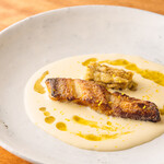 着想は、味噌とバターの相性の良さから自然に湧き出たものだそう。料理を作る上で一番大切にしていることは「一口食べた瞬間に感じられる本能的なおいしさ」と語る角谷氏自身の直感力と、料理人としての経験値が感じられる一皿だ。