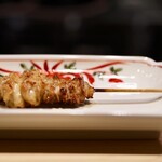 焼き鳥店ではおなじみの一串だが、火の通りの異なる素材を、同時にベストの状態に焼き上げなくてはならないこのねぎま、上手に焼くのはなかなか難しい。ともすればネギが生焼けだったり、あるいは焼きすぎで鶏のジューシーさが失われたりするからだ。が、目の前に置かれた焼きたてのそれは、皮はこんがり狐色。手にしたそばから肉汁が滴り落ち、シズル感たっぷり。パリッと香ばしい歯ざわりの皮に対し、心地よい弾力のある腿肉は咀嚼の度、旨味がほとばしる。