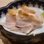 料理は「鳥しき」同様ストップ制のおまかせコース。鶏も同じ「伊達鶏」?と思いきや、メインに使っているのは神奈川の「丹沢滋黒軍鶏」。趣味のツーリングの途中で見つけたそうで「平飼いの養鶏場があるというので見学に行ったところ、これがすばらしくて。完全無投薬で飼料にも気を配り、本当に丁寧に育てている。そして大切に扱っているんです。たとえば、怪我をした鶏は通常なら処分してしまうのですが、ここでは隔離して育て、自分達の賄いにするなど命に敬意を払ってきちんといただく。そうした姿勢に、鶏好きとしては、感銘を受けました」とのこと。