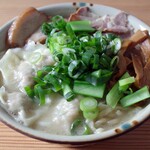 訪れた人が何よりも絶賛しているのはスープのおいしさ。豚や鶏、牛の動物系のだしをメインに、魚介や野菜の旨みをプラス。コラーゲンが満ち、少し濁ったスープはトロミもあり、各種の旨みが重なり合い、滋味深く濃厚な味わいです。