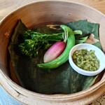 ドリンクはオリジナルレシピの「自家製果実酒」がおすすめ。紅玉と生姜のほのかな甘みの「Detox」、ジャスミンティーに杏仁の香りの「Relax」、アプリコットとナツメにシナモンが香る濃密な味わいの「For woman」、ライム・ミント・レモングラスの爽やかさの「Reflesh」があり、水・湯・ソーダで割って提供します。その他、日本ワインを含む各国の自然な製法のワインもそろえています。
