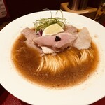 甘い醤油スープです。カシスが効いているからなのか!?ちょっと甘いがおいしいですし、私は好きです。鴨の旨味がちょっと感じる!醤油タレにも鴨ガラや鴨の血を凝縮し、鴨のエキスを閉じ込めているらしい。カシスで甘さが強い!鴨チャーシューが私はかなり美味しかったです(^-^)v味玉マニアの味玉は …… 柔らかくて旨い!こちらは柚子とポルチーニ茸をベースに …… これまた上品な香り(^.^) スープに合わせた味玉でした!麺はサッポロ製麺さんと試行錯誤で重ねた特注麺でちょっと硬く、ツルッとした食感でまぁおいしく、スープに合った感じで ……グッと!』(特盛ヒロシさん)