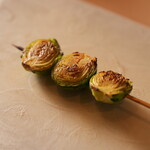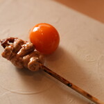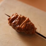 同店の焼鳥は、目黒「鳥しき」継承の火入れ方法である「近火の強火」による絶妙な焼き加減。350℃を超える高温で表面を素早く焼き、肉汁を閉じ込めジューシーで旨みを引き出す焼き方で、うちわで扇ぎつつ常に串を動かして、タレをつけるタイミングを見誤らないプロの技が光ります。