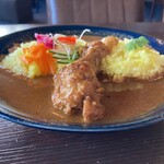 3分ほどで到着。サフランライスを中央に、左にチキン、右にポークジンジャー。シャバシャバ系のチキンは、じんわりと辛さが追いかけてくる滋味深い味わい。一方でポークジンジャーは、生姜が全面に出て、豚肉の旨みとマッチ。どちらもサラサラっと食べられ、あっという間に完食』(アダログさん)