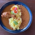 メニューはスパイスが効いたカレーと柔らかいチキンのバランスが良い「チキンカレー」1,000円、「ポークジンジャーカレー」1,000円、「相がけカレー」1,200円で、スパイスと一緒に炊き込んだターメリックライスがつきます。トッピングには「スパイス卵」200円と刺激的な「ジョロキアキーマ」200円があります。