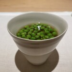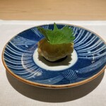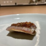 まず半身だけ火を入れたアオリイカのセビーチェにはアクセントにかんずりを利かせたクラマトソース。通常のクラマトはトマトに干したハマグリで旨味をプラスしているが、ブランドン流クラマトはトマトウォーターに生姜やコリアンダー、チリやレモンを加えたフレッシュで軽い仕上がり。