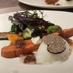 「タスマニアサーモンの瞬間燻製」はファンも多い店のスペシャリテ。サーモンに軽く燻香を付ける程度に半生にスモークし、エシャロットとシェリービネガーとバルサミコ酢の酸味を利かせたソースをかけていただく。そのまま食べても半生の食感と燻香、ソースが絡んで絶妙なおいしさだが、温泉卵を混ぜるとカルボナーラのような雰囲気にもなる。