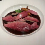 合わせてもらったのは、フランス・ルーション地方の赤ワイン。「赤ワイン煮込みはしっかりした肉料理なので、ベリーのニュアンスがある果実味が豊かな赤ワインを選びました。クラシックな肉料理とピチピチと弾けるような果実味をもつ自然派ワインは新しい美味しさをもたらしてくれるはずです」と小村シェフ。これぞ、テチュがめざすマリアージュの完成形の1つ。新しいマリアージュ体験が存分に楽しめた。