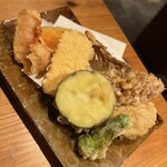 料理はおまかせのコース(17,325円〜)1本。先代が天ぷら懐石の店だったことを受け継いで、西岡氏のコースでも天ぷらをメインに据え、お客さんの目の前で一品ずつ揚げたてを提供しています。食材も生産者のもとを訪ねて取引をはじめた品や、信頼できる八百屋から仕入れる野菜など厳選したものばかり。コースでは季節の天ぷらが6~7品ほどで、旬の食材が並びます。