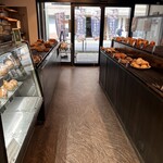 店舗はベージュに黒のラインのシンプルな外観。かわいいパンの看板が目印です。店内はパンの販売スペースだけでなく、焼きたてのパンをドリンクと共にいただけるカフェスペースもあります。